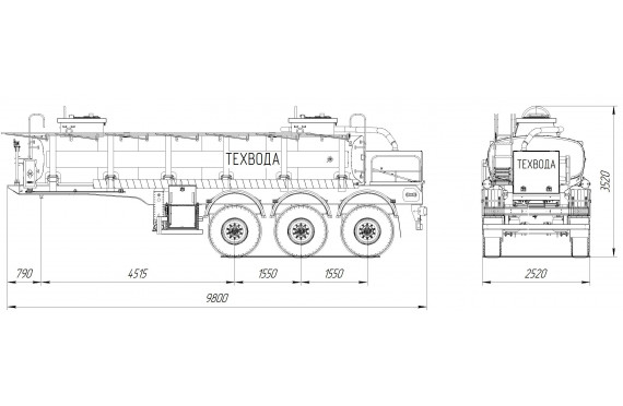 16,500 литров, прямое сечение, шины 425/85R21/6+1, рессорная или пневматическая подвеска. дополнительная опция: мотопомпа.