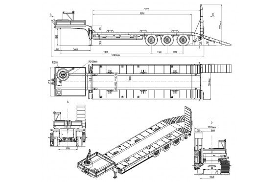 45000 кг, шины 445/65R22,5 или 395/85R20 / 6+1, платформа 10300 (11080 до трапов) x 2500 с уширителями до 3000 мм, механические трапы, ССУ 1510 мм, рессорная подвеска, съемные стойки 1500 мм