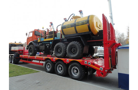 45000 кг, шины 445/65R22,5 или 395/85R20 / 6+1, платформа 10300 (11080 до трапов) x 2500 с уширителями до 3000 мм, приставные алюминиевые трапы, ССУ 1510 мм, рессорная подвеска, съемные стойки 1500 мм, съемные борта