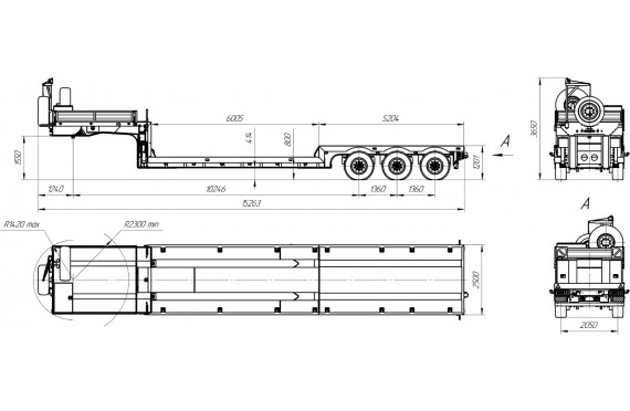 42100 кг, шины 395/85R20 или 445/65R22,5 / 6+1, платформа 9280 (10142 до трапов) x 2530 с уширителями до 3030 мм, ССУ 1510 мм, рессорная или пневматическая подвеска