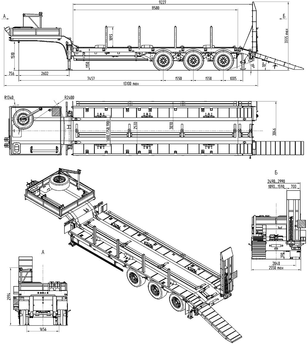 39000 кг, шины 385/65R22,5 или 445/65R22,5 / 6+1, платформа 11080 до трапов) x 2500 с уширителями до 3000 мм, ССУ 1510 мм, рессорная подвеска, съемные стойки 1500 мм, механические трапы