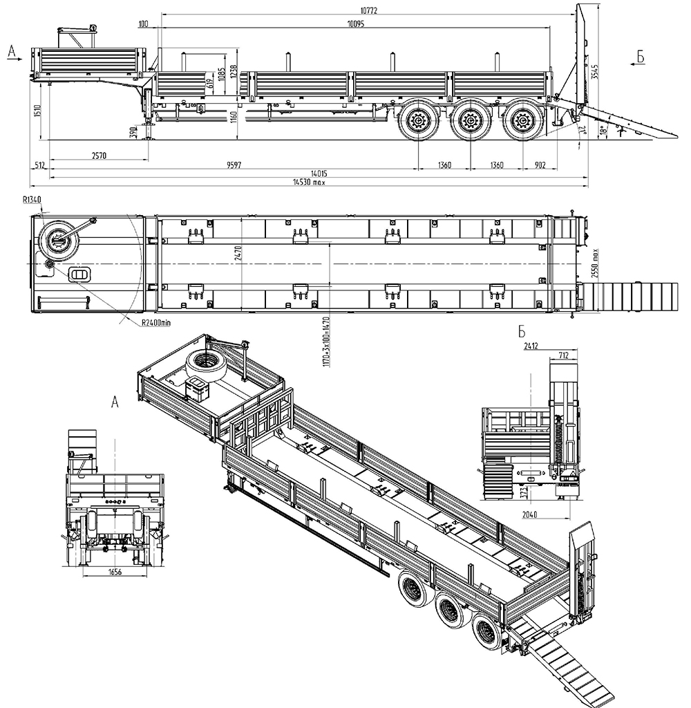 32200 кг, шины 385/65R22,5/6+1, платформа 8500 (9227 до трапов) x 2530 с уширителями до 3030 мм, ССУ 1510 мм, рессорная или пневматическая подвеска