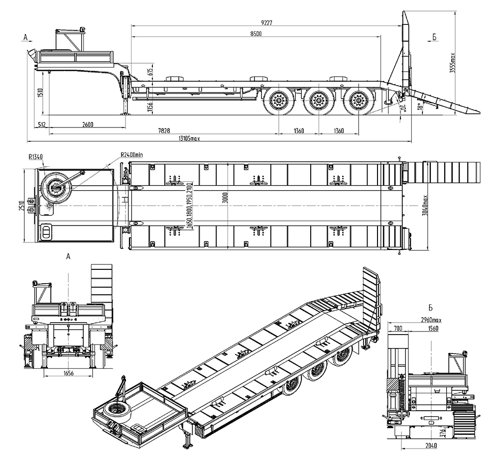 39000 кг, шины 385/65R22,5 или 445/65R22,5 / 6+1, платформа 11461 по трапам x 2500 с уширителями до 3000 мм, треугольные аппарели, ССУ 1430 мм, рессорная подвеска, съемные стойки или раздвижные коники 1500 мм, с бортами или без