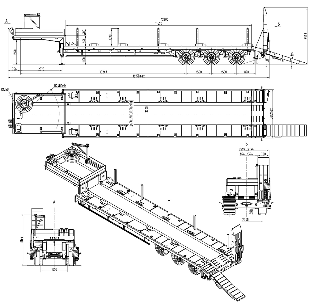29800 кг, шины 385/65R22,5/6+1, платформа 11474 (12200 до трапов) x 3000 мм, ССУ 1550 мм, рессорная или пневматическая подвеска, съемные стойки